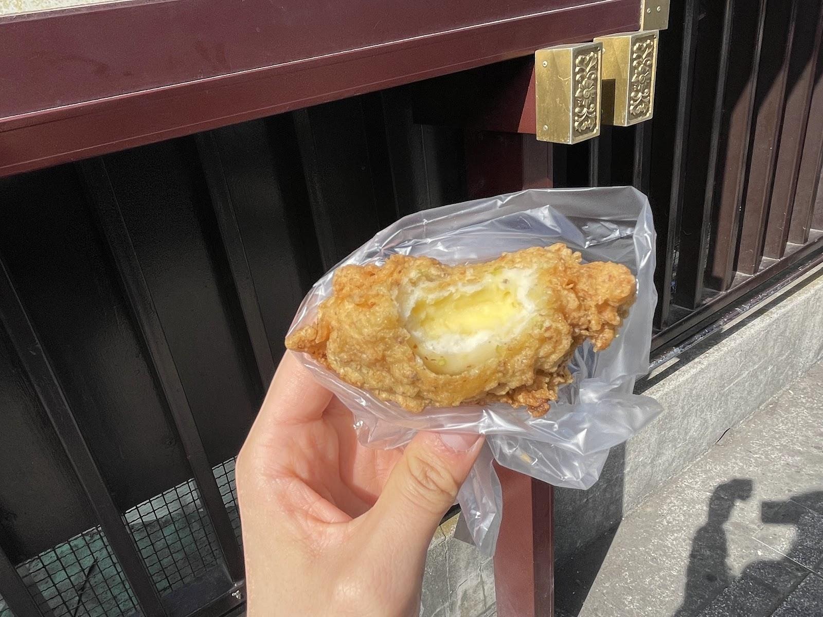 이것은 커스터드 아게 만쥬(250엔)입니다. 갓 만든 것이라 만지면 매우 따뜻합니다. 겉은 고소하고 바삭하며, 속에는 부드럽고 달콤한 커스터드가 들어 있어, 다시 아사쿠사에 오면 반드시 사고 싶을 정도로 맛있습니다. 1개씩도 구매할 수 있어 출출할 때 추천합니다. 이 가게는 현금 결제만 가능하니, 반드시 현금을 지참하세요.