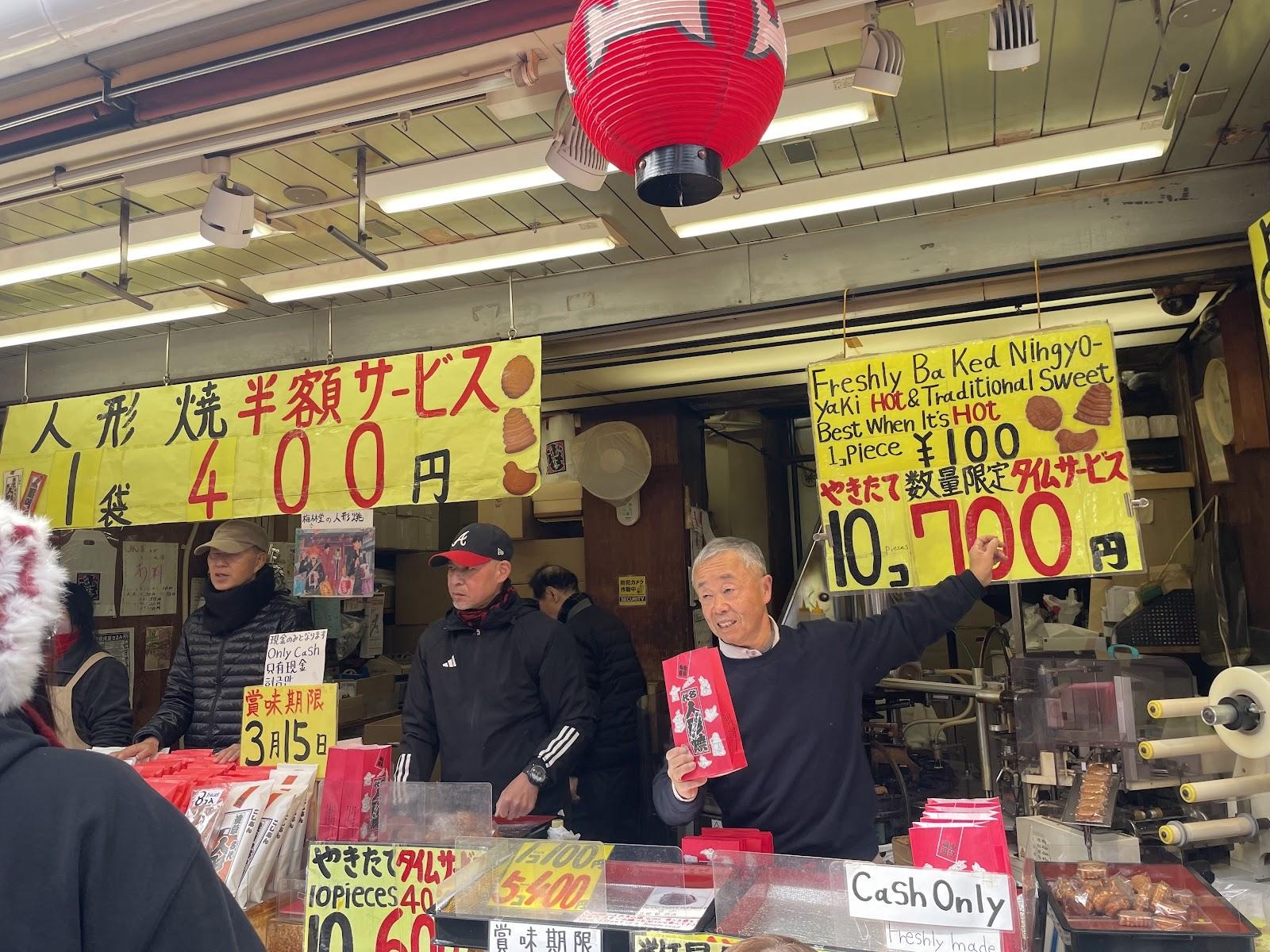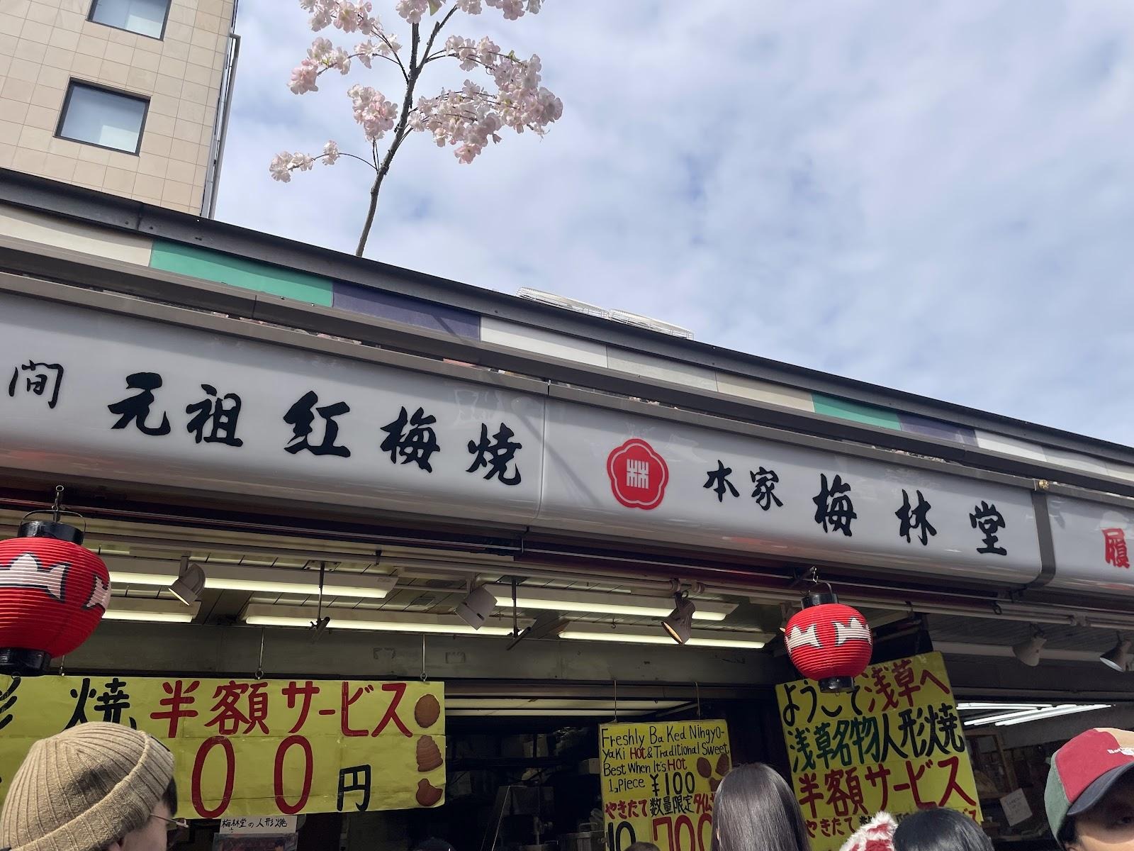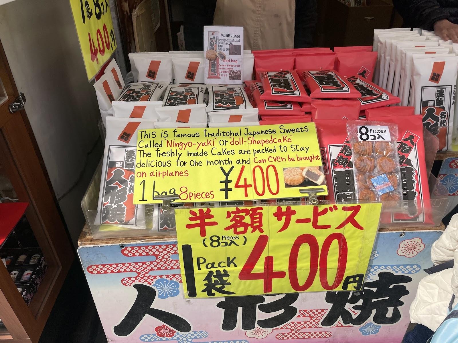 혼케 바이린도(本家 梅林堂)는 나카미세 거리에 들어서자마자 만나는 첫 번째 닌교야키 가게입니다. 가게 안에서 닌교야키를 직접 구워 갓 구운 맛을 즐길 수 있습니다. 물론 기념품용으로도 구매할 수 있습니다. 가격도 부담 없이, 사진처럼 타임 서비스도 자주 진행됩니다. 합리적인 가격과 맛 덕분에 가게 앞은 항상 사람들로 붐빕니다. 이곳도 현금 결제만 가능합니다.