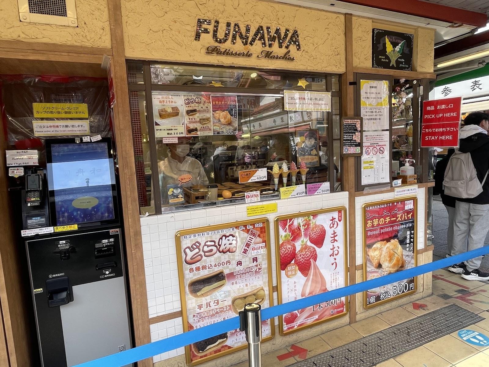 나카미세 거리 매장에는 기념품뿐만 아니라 그 자리에서 먹을 수 있는 디저트도 준비되어 있습니다. 고구마를 사용한 도라야키, 치즈파이, 아이스크림 등이 있습니다. 먼저 그 자리에서 후나와의 고구마 디저트를 맛보고, 그 맛을 기념품으로 사서 가져가는 것을 추천합니다.