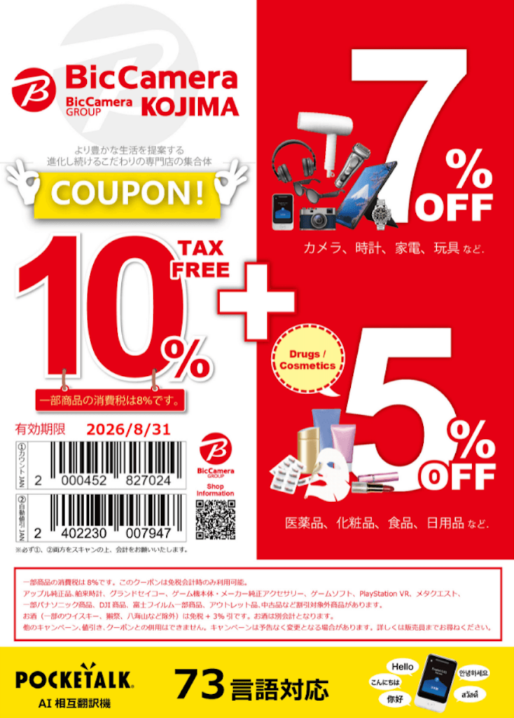빅카메라에서는 일본을 방문한 외국인 여행자를 대상으로 LIVE JAPAN 한정 쿠폰을 제공하고 있습니다. 이 쿠폰을 이용하면 면세 대상 상품을 구매할 때 10% 면세에 더해 최대 7% 할인이 추가로 적용됩니다.