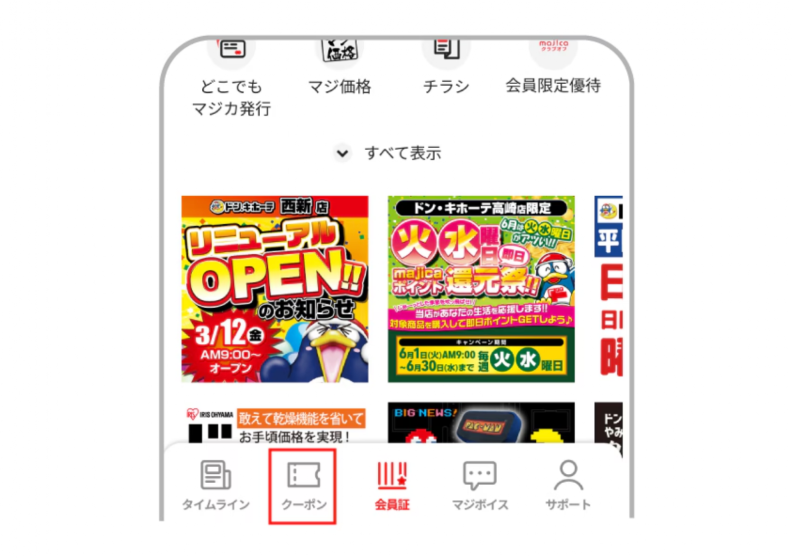 돈키호테 majica 앱 회원용 쿠폰은, 회원증 스캔형과 제시형 쿠폰형의 두 가지가 있습니다. 회원증 스캔형은, 보유한 쿠폰을 계산대에서 회원증 바코드를 제시하기만 하면 자동으로 할인이 적용됩니다. 제시형 쿠폰형은, 앱에서 보유한 쿠폰을 계산대 직원에게 제시하고, 직원이 조작함으로써 할인이 적용됩니다.