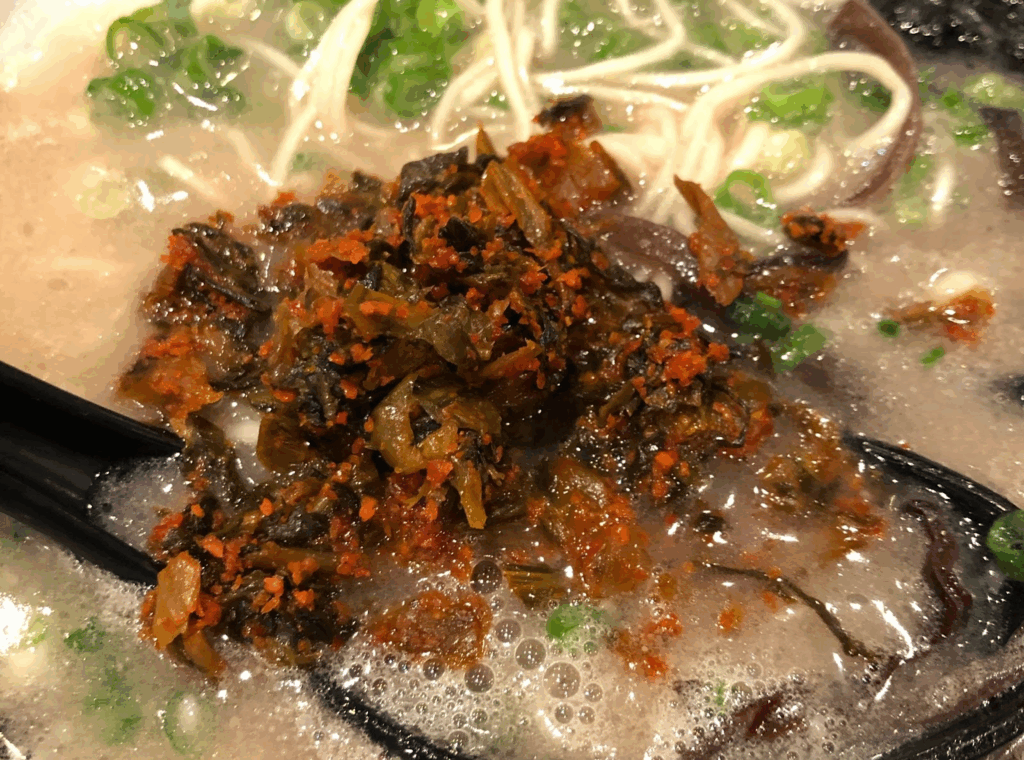테이블에는 매운 다카나(辛子高菜)나 홍생강(紅ショウガ) 등을 자유롭게 이용할 수 있어, 맛의 변화를 즐길 수 있는 것도 매력. 중간에 다카나를 넣으면 매콤한 포인트를 즐길 수 있습니다.