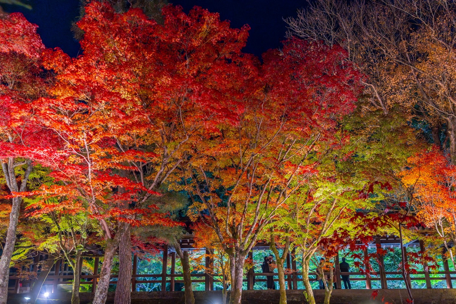 도후쿠지(東福寺)의 츠우텐쿄(通天橋) 다리에서는 단풍 터널 같은 경관이 펼쳐져 많은 사진 애호가들이 찾습니다. 11월 중순~하순이 절정이며, 야간 라이트업을 하는 사찰(寺院)도 있어 낮과 밤 다른 매력을 즐길 수 있는 것도 매력입니다.