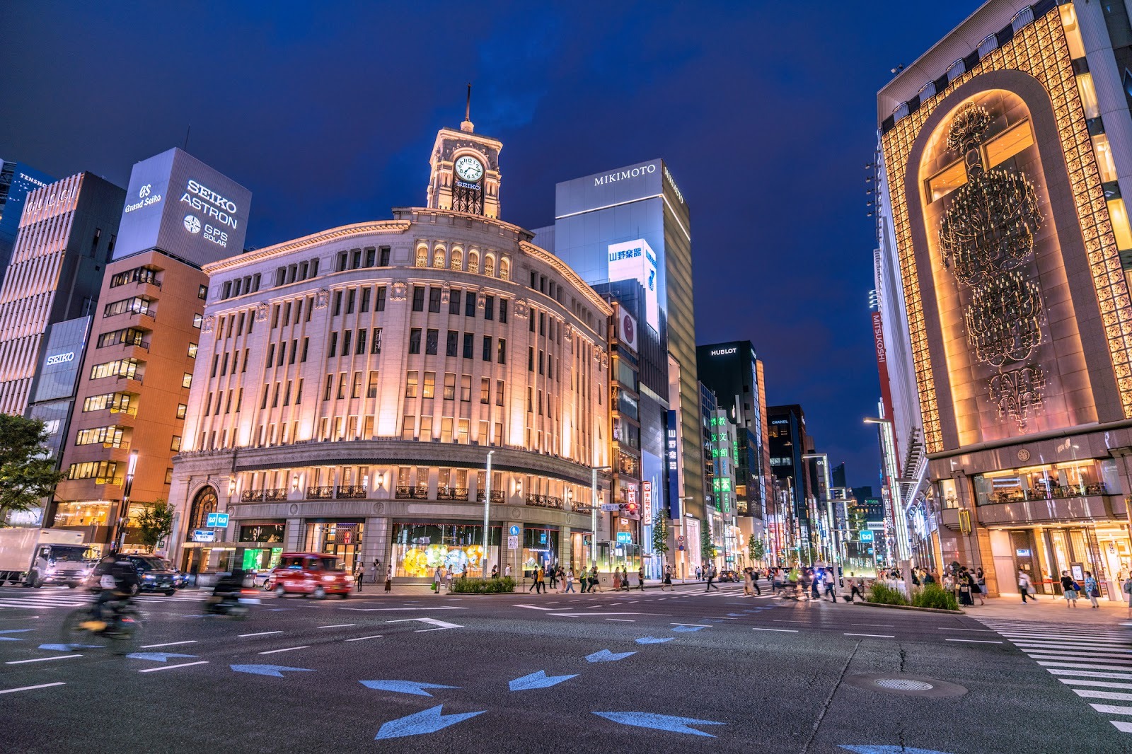 샤넬, 루이비통 등 하이엔드 브랜드는 물론, GINZA SIX·와코(WAKO / 和光) 같은 대형 쇼핑몰이 모여 있습니다.