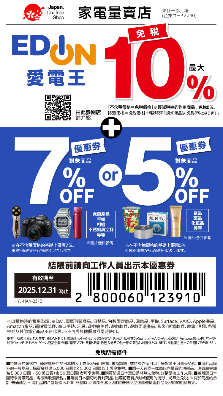 에디온은 가전에서 일용품까지 갖춘 인기 체인점입니다. 5,000엔 이상 구매할 경우, 면세 10%에 더해 5〜7% 할인받을 수 있는 쿠폰을 배포 중. 에디온도 상품 카테고리별 할인률이 다릅니다.