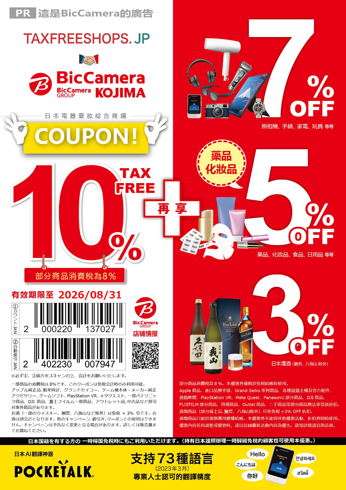 빅카메라는, 일본을 대표하는 대형 가전제품 판매점. 외국인 관광객을 대상으로 10% 할인에 더해 최대 7% 할인 쿠폰을 이용할 수 있습니다. 상품별로 할인 금액이 다릅니다.