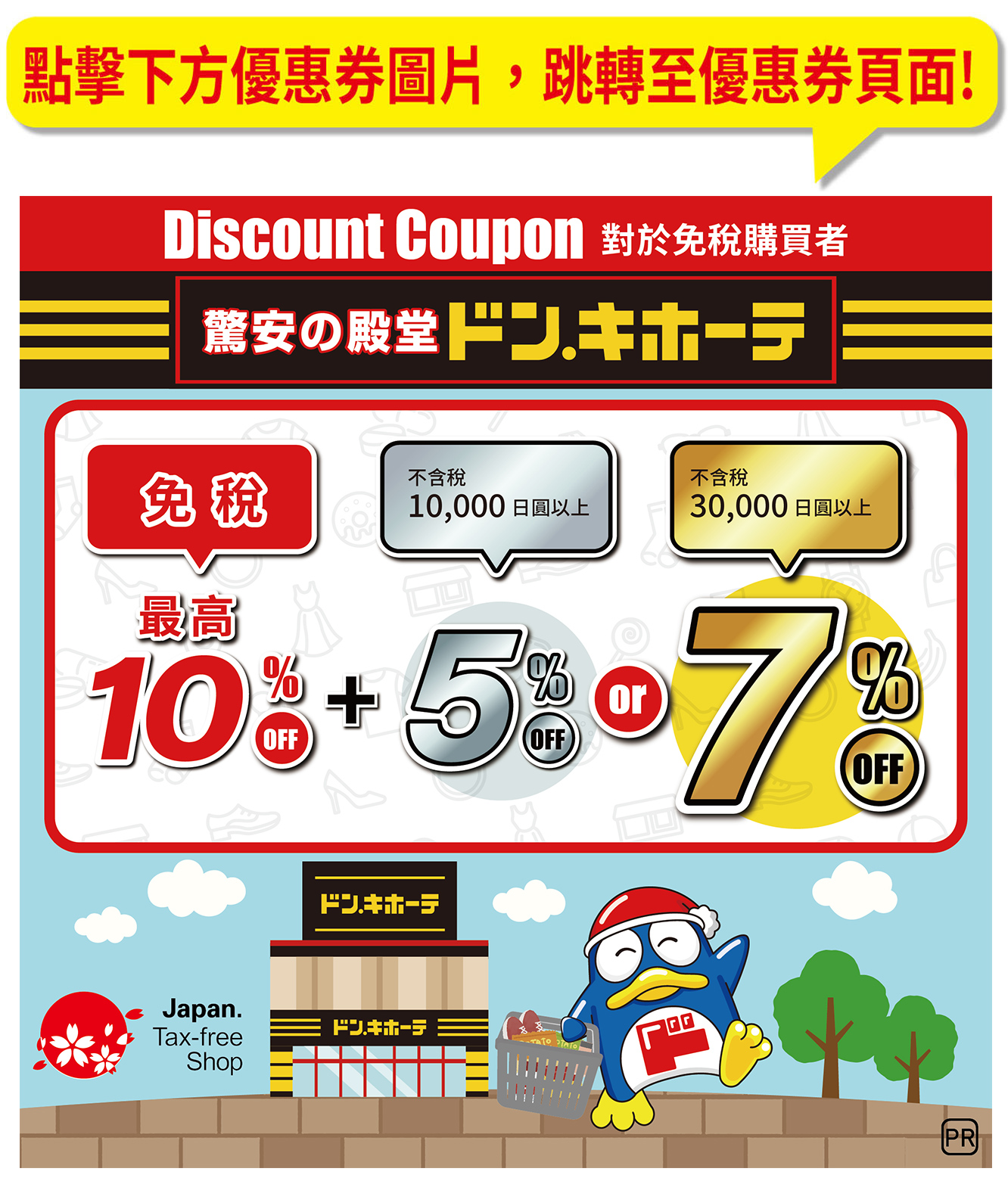 돈키호테는, 일본 전국에 퍼져있는 총합 할인 판매점. 외국인 관광객을 상대로 10%의 면세에 더해 7% 할인 되는 쿠폰을 제공하고 있습니다.(※)1회당 10,000엔 이상 구입시 5% 할인, 30,000엔 이상 구입시 7% 할인을 받을 수 있는 점이 특징. 일용품이나 화장품, 가전, 식품 등 폭넓은 상품이 대상입니다.