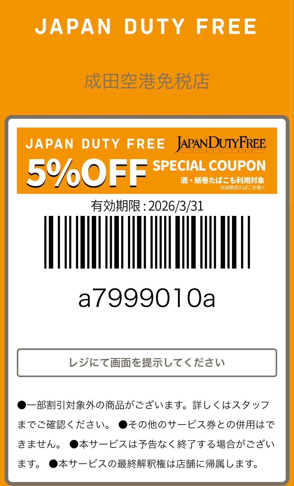 나리타 공항의 면세점에서도 쿠폰을 이용할 수 있습니다. 내용은, 면세 가격에 더해 5% 할인이 적용된다는 점. 술이나 담배 구매시에도 이용할 수 있는 점이 특징입니다.