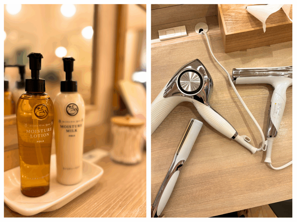 깔끔하게 정돈된 파우더룸에는 화장수와 로션은 물론, ReFa 브랜드의 드라이기와 고데기까지 완비되어 있습니다.