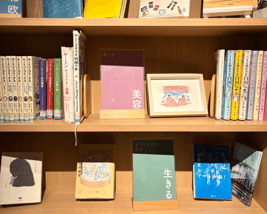 서적은 ‘미용’, ‘여행’, ‘삶’ 등 테마별로 구분되어 있어, 마음을 끄는 한 권을 찾는 시간이 정말 즐겁습니다.