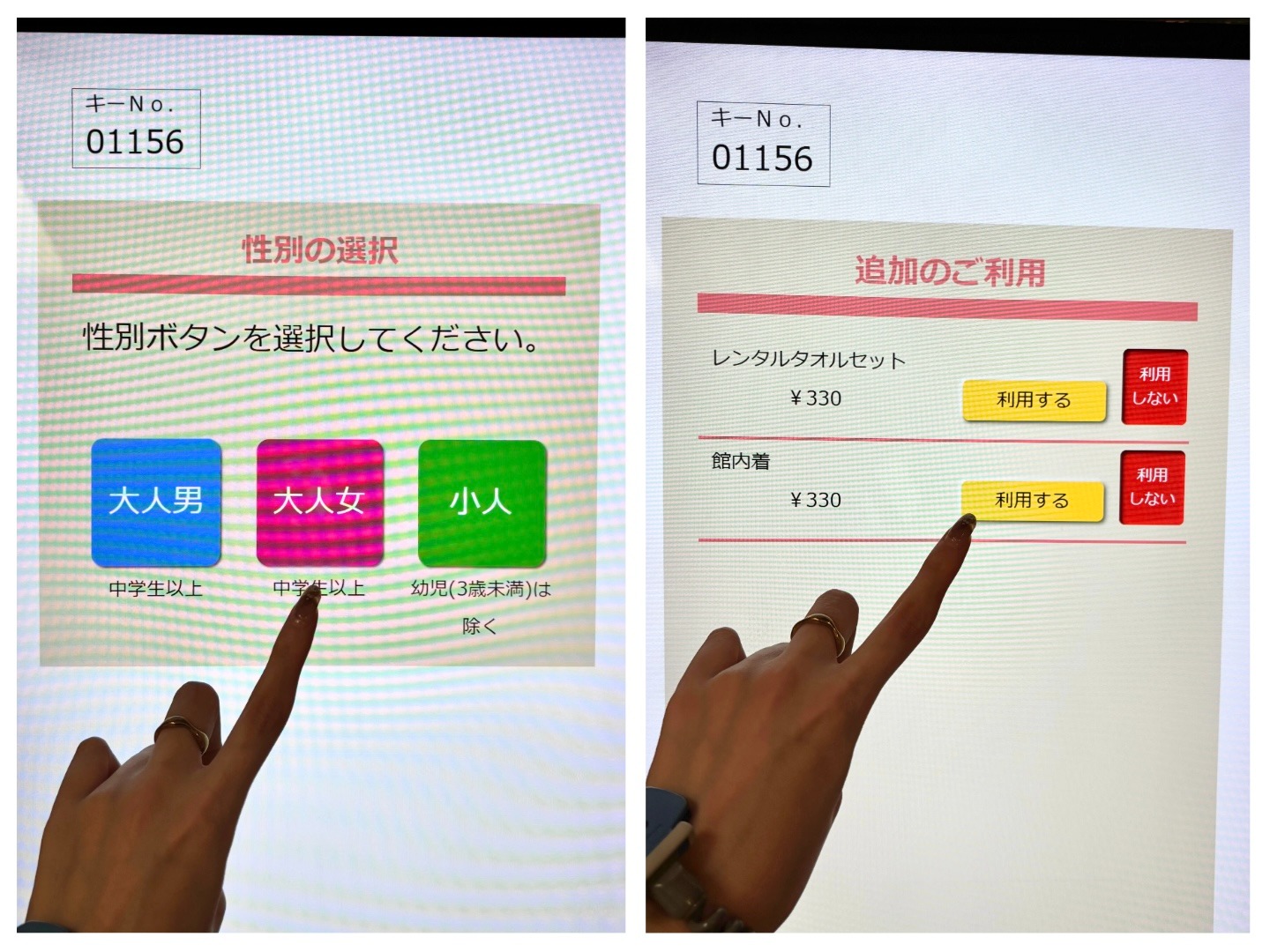 화면 안내에 따라 ‘성별’과 ‘입장 코스’를 선택하고, 타월이나 실내복을 빌리고 싶을 때는 여기서 미리 옵션을 선택합니다.