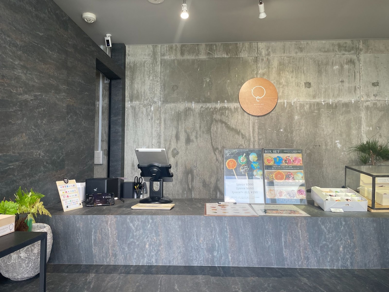 매장 내부에는 오키나와 바다를 모티브로 한 아트 작품이 전시되어 있으며,콘크리트 벽과 내추럴한 인테리어가 조화를 이룹니다.