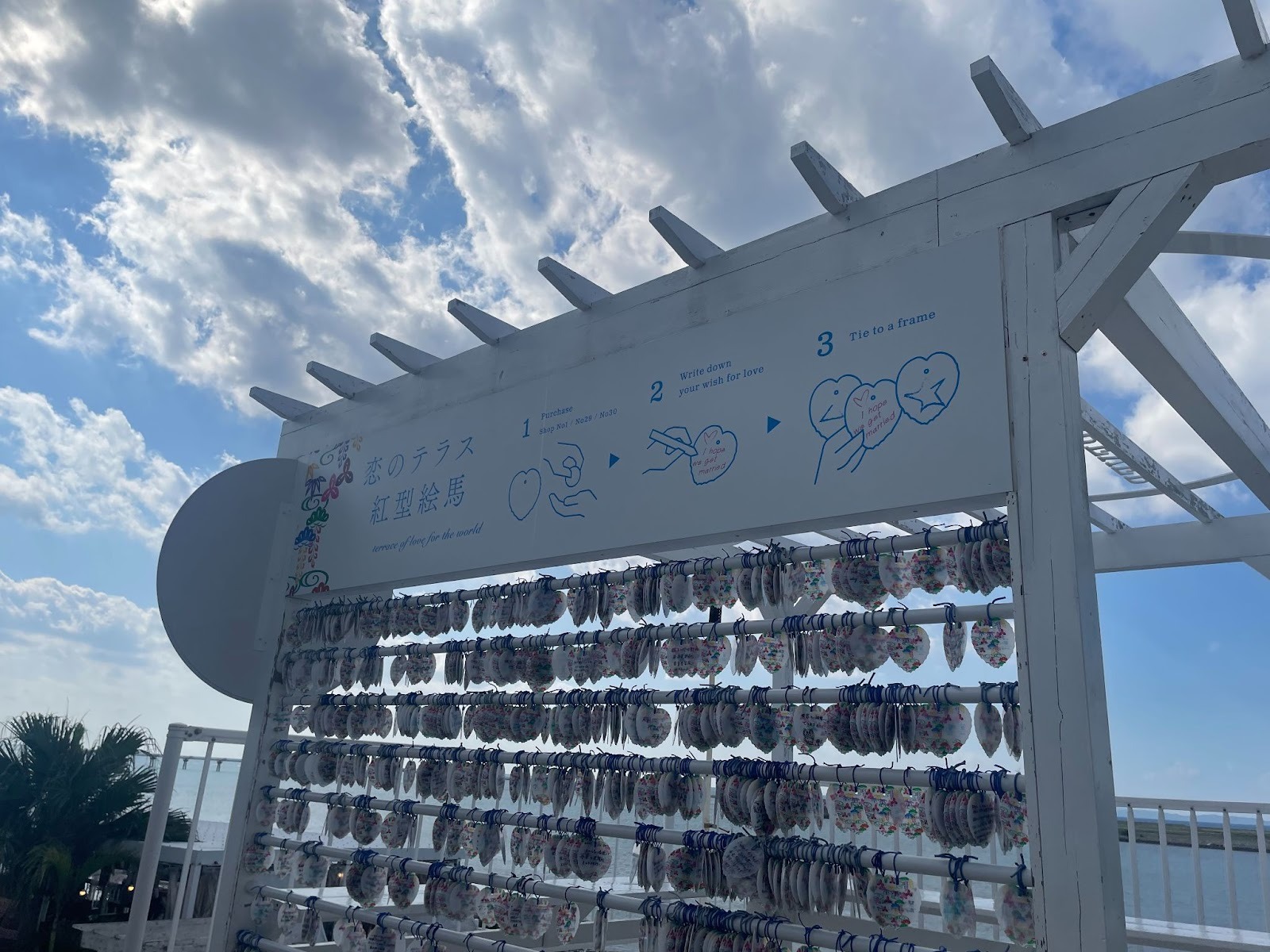 아름다운 바다를 배경으로 연애 성취, 행복한 결혼을 기원하는 에마가 걸려 있습니다.