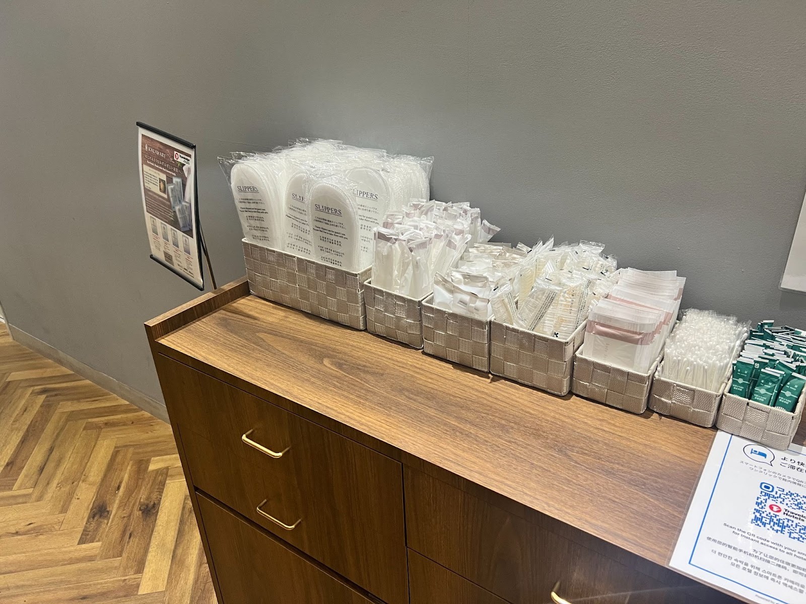 객실에는 기본적인 어메니티가 구비되어 있으며, 추가로 필요한 물품은 1층 입구에 있는 ‘어메니티 바’에서 자유롭게 가져올 수 있습니다.