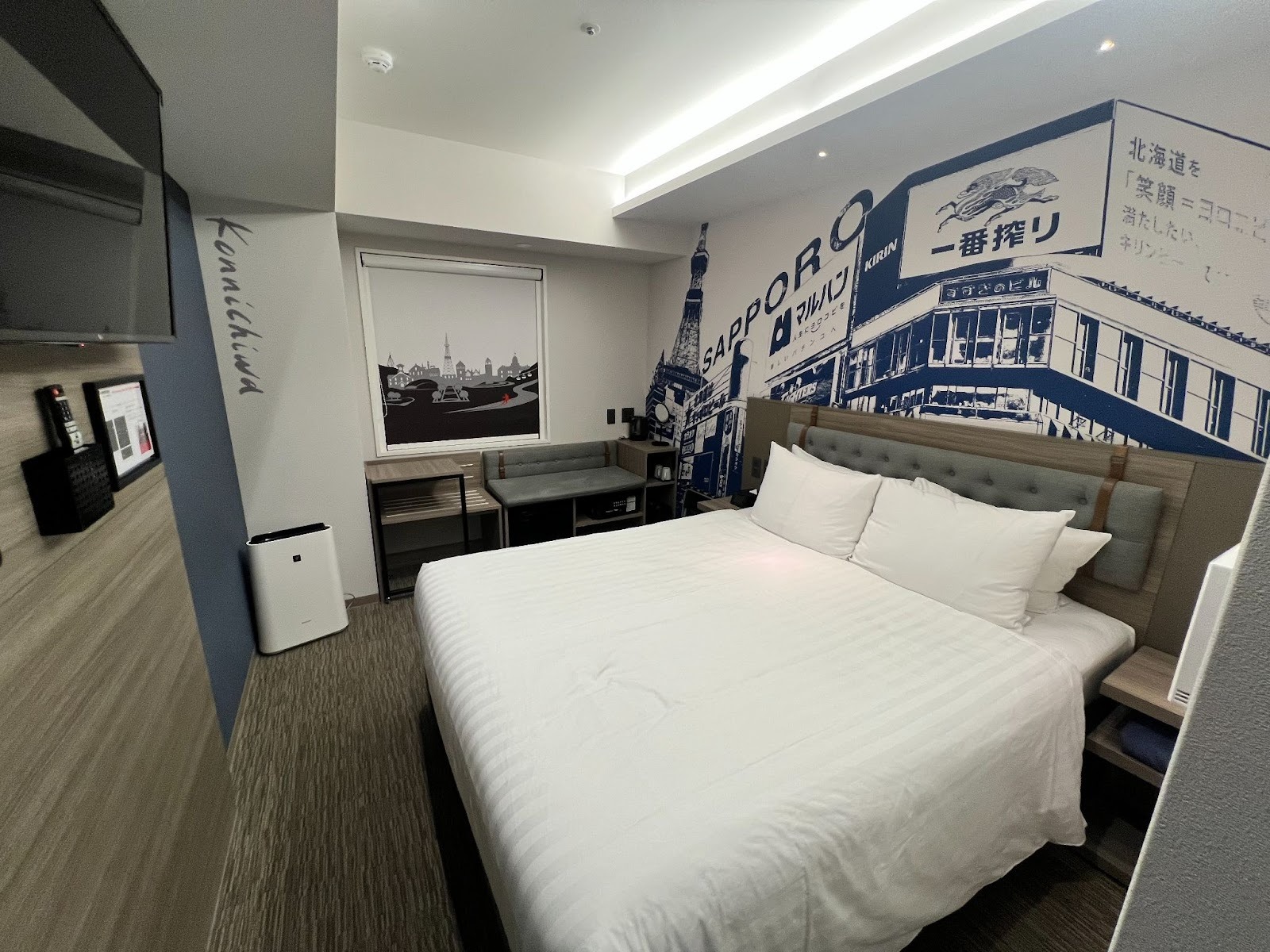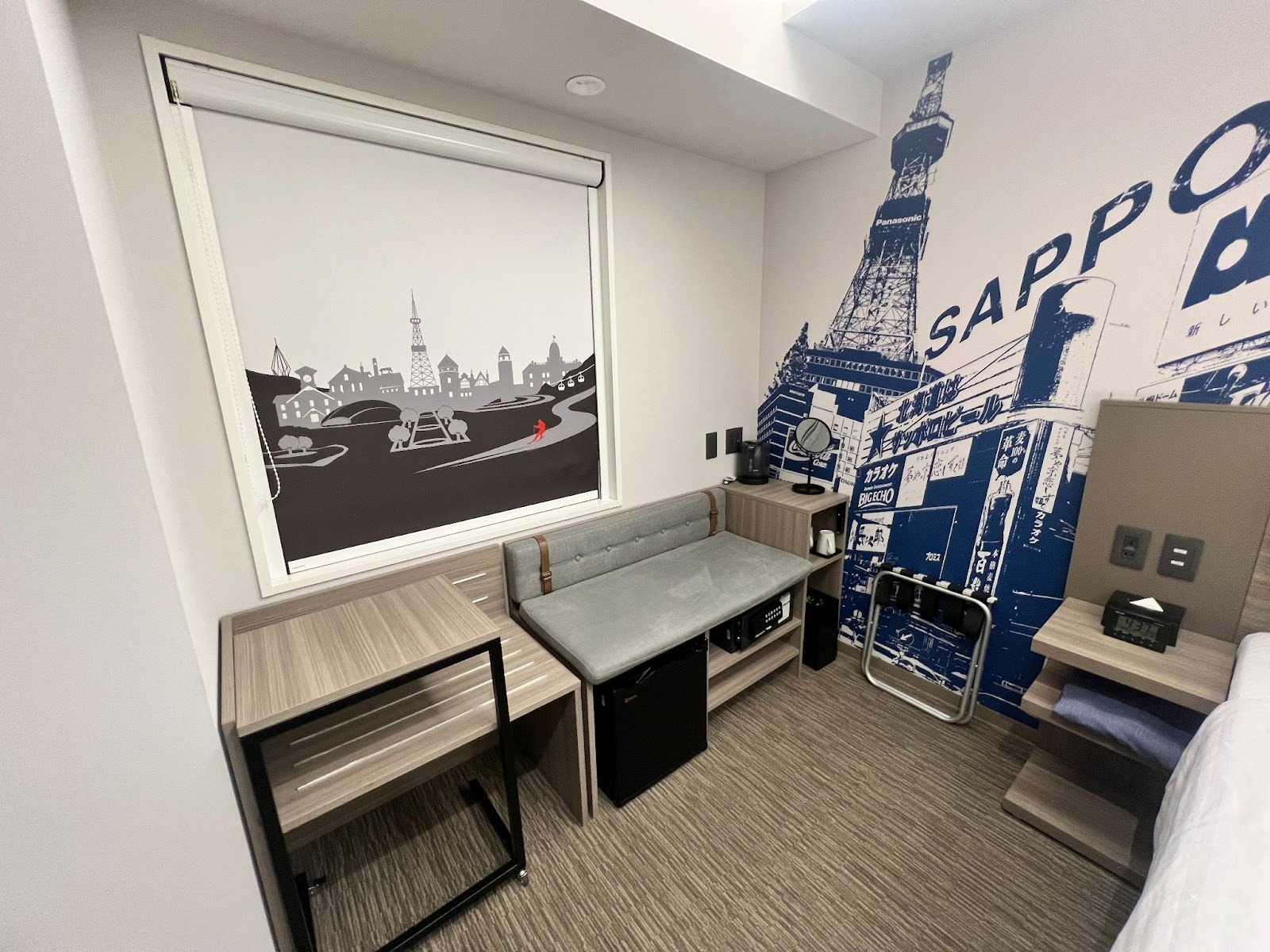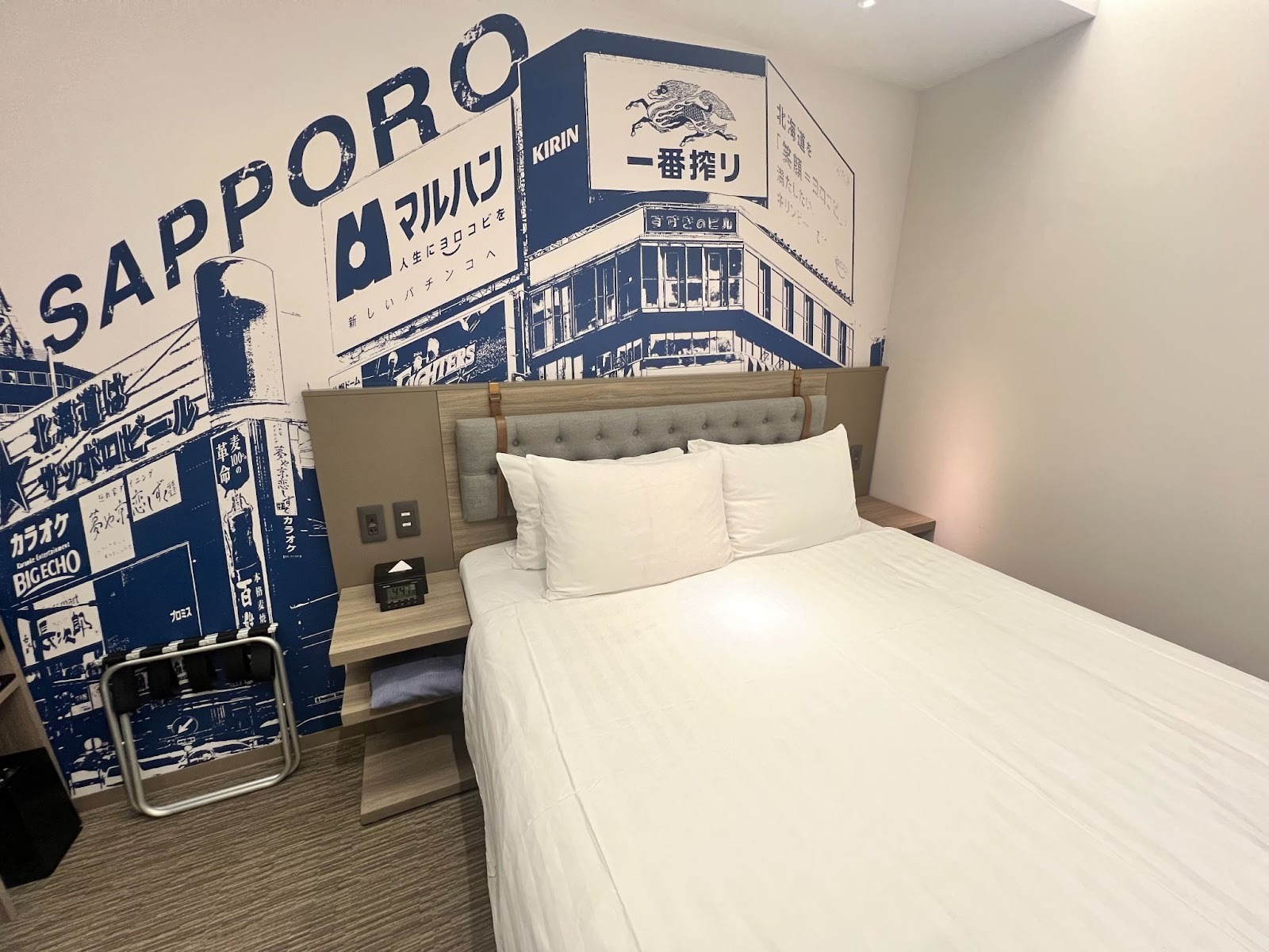 넓은 더블베드 또는 트윈 베드를 갖추고 있으며, 매트리스는 조금 단단한 편으로 숙면을 취하기에 좋습니다. 벽면에 그려진 삿포로 거리 일러스트가 인상적으로, 여행의 설렘을 객실 안에서도 그대로 느낄 수 있습니다.