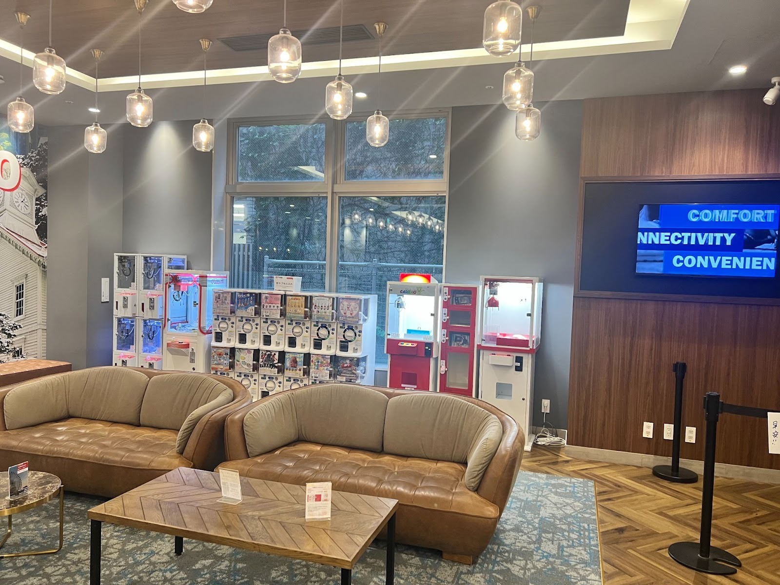 입구에는 넓은 소파와 캡슐 뽑기 기계가 설치되어 있어 캐주얼하면서도 놀기 좋은 분위기입니다.