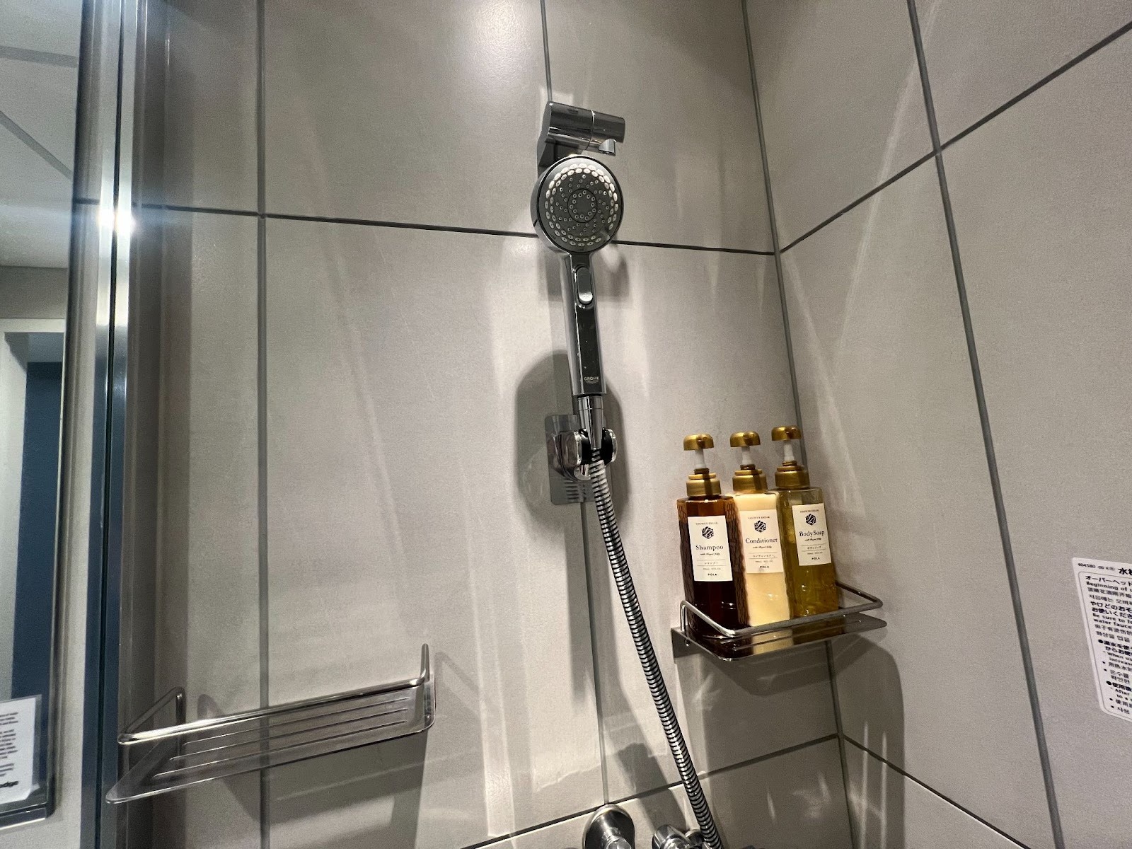 욕조는 없는 대신 샤워 부스를 이용할 수 있습니다. 특히 주목할 점은 독일의 고급 수전 브랜드 **그로에(GROHE)**의 샤워기를 도입했다는 것입니다.