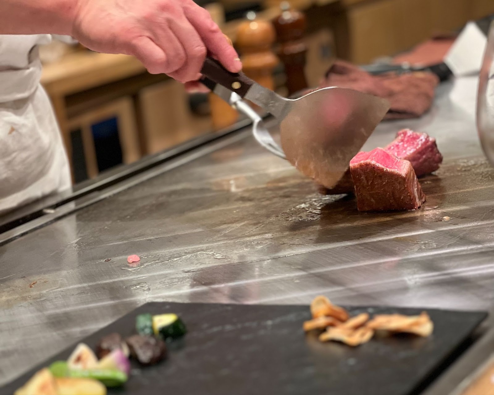 와규 스테이크의 매력은 한 입이 오감(五感)을 자극하는 체험형 진미라는 점입니다. 특히 철판 구이 스타일에서는 프로 요리사가 눈앞에서 고기의 상태를 확인하며 절묘한 불 조절로 구워줍니다.