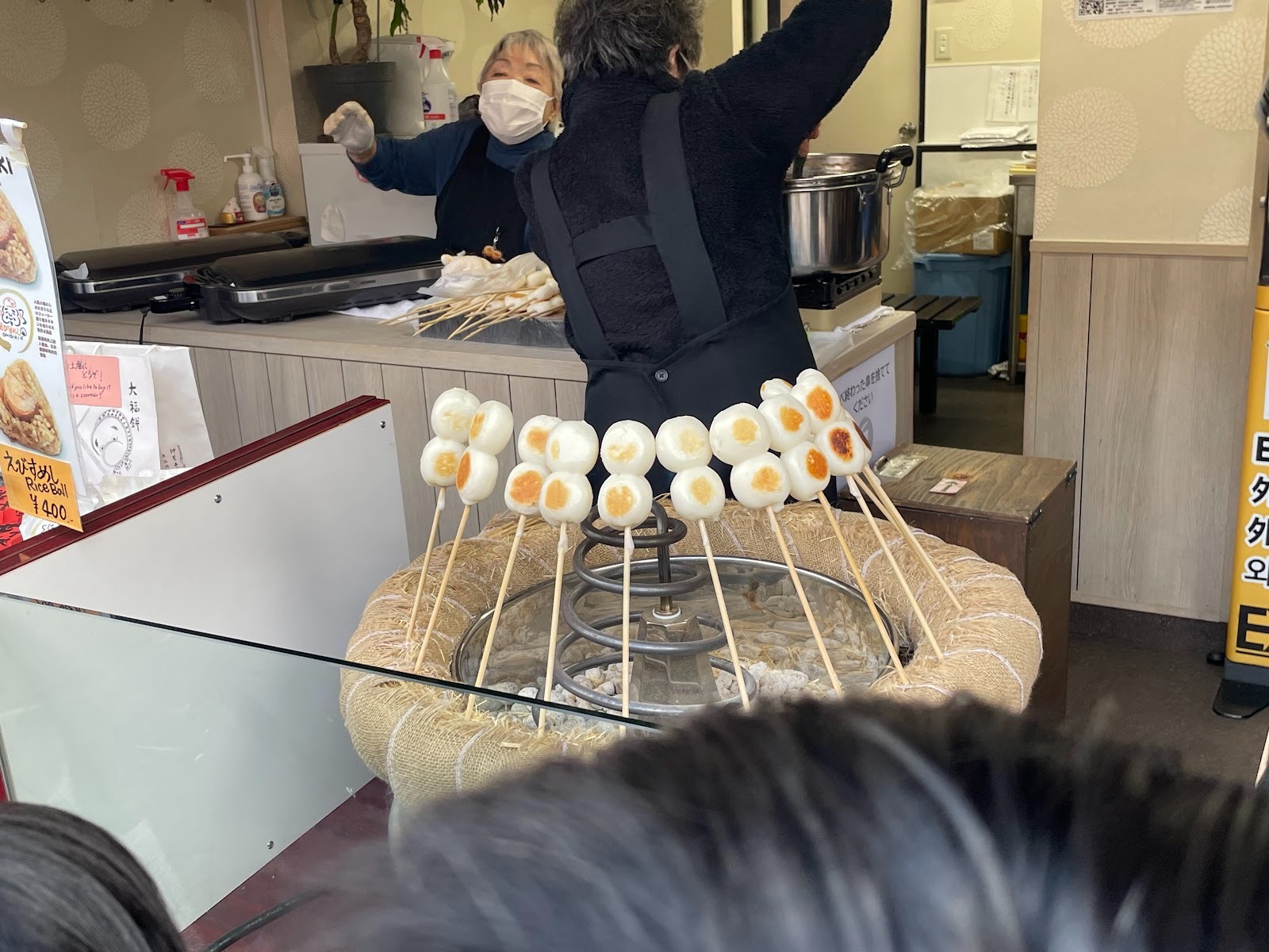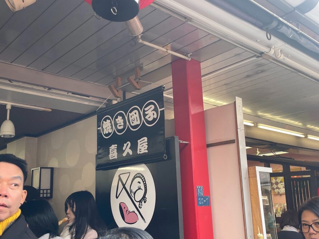 仲見世通的「焼団子 喜久屋」提供現烤糰子,看到烤製過程會令人忍不住想吃,店前經常擠滿顧客。糰子的溫和甜味與醬汁的鹹香完美搭配,非常受歡迎。