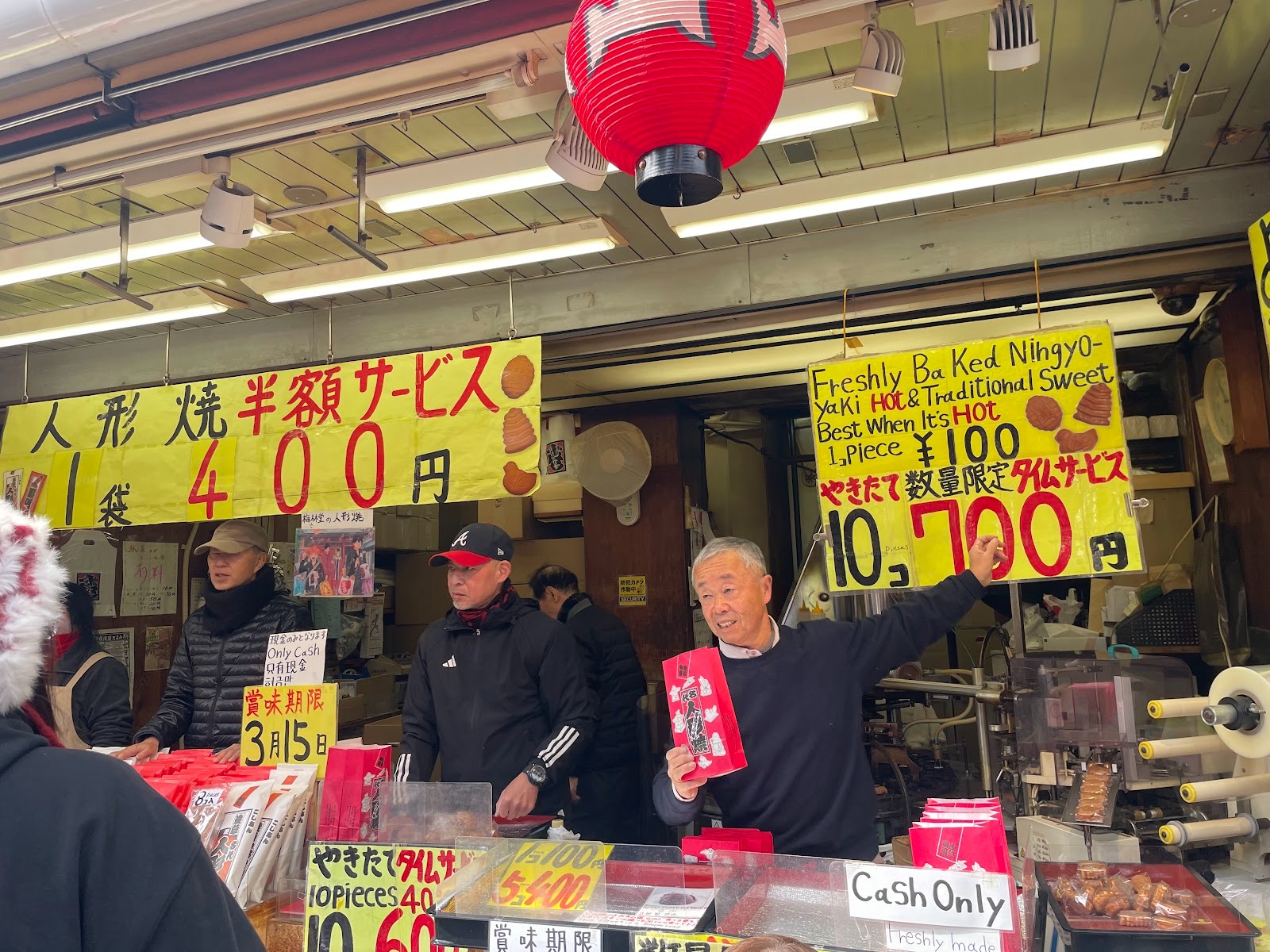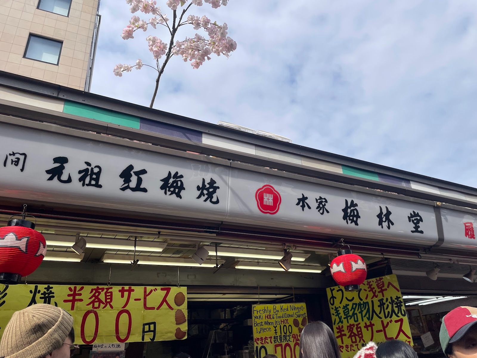 「本家 梅林堂」是仲見世通入口附近的第一家人形燒店。店內現場烘烤人形燒,顧客可以品嚐到剛出爐的熱騰騰口感,當然也可以購買伴手禮。價格親民,像照片中所示,店家也會經常推出限時優惠。由於價格實惠又美味,店前總是人潮洶湧。這家店也僅接受現金付款。