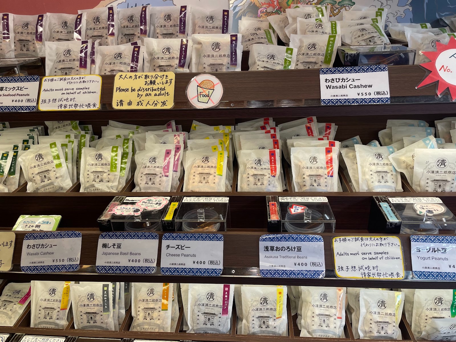 仲見世通內的「小澤清二郎商店」販售承襲職人技法製作的豆菓子,也有現代口味,如優格豆或起司花生等。店內可試吃,挑選自己喜歡的口味。