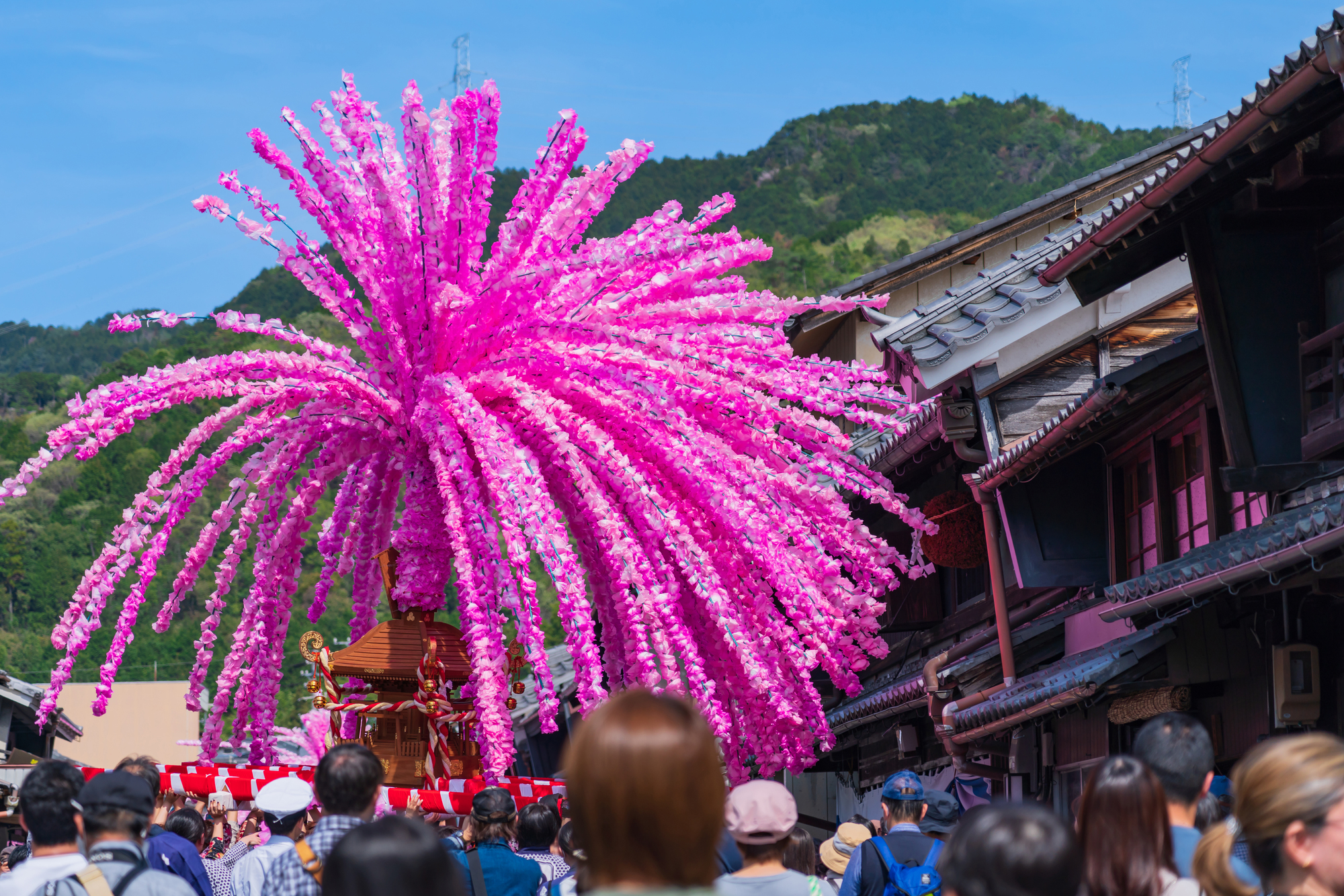 美濃市以傳承千年的「美濃和紙」聞名,而「美濃祭」最具特色的便是由這些和紙打造的「花神轎」。當地居民將和紙染成粉嫩的櫻花色,手工製作成數千朵花瓣並裝飾在長長的竹片上,綁在神轎頂端。當數十座神轎在古街中奔跑跳躍時,粉紅色的和紙花瓣隨之劇烈晃動,遠看就像是數十棵櫻花樹在街道上狂舞,視覺效果極其震撼且唯美。除了花神轎,祭典中還有充滿幽默感的「流仁輪加」表演,能讓人感受到江戶時代町人文化的活力與趣味,是體驗日本職人工藝與庶民生活結合的最佳場所。
