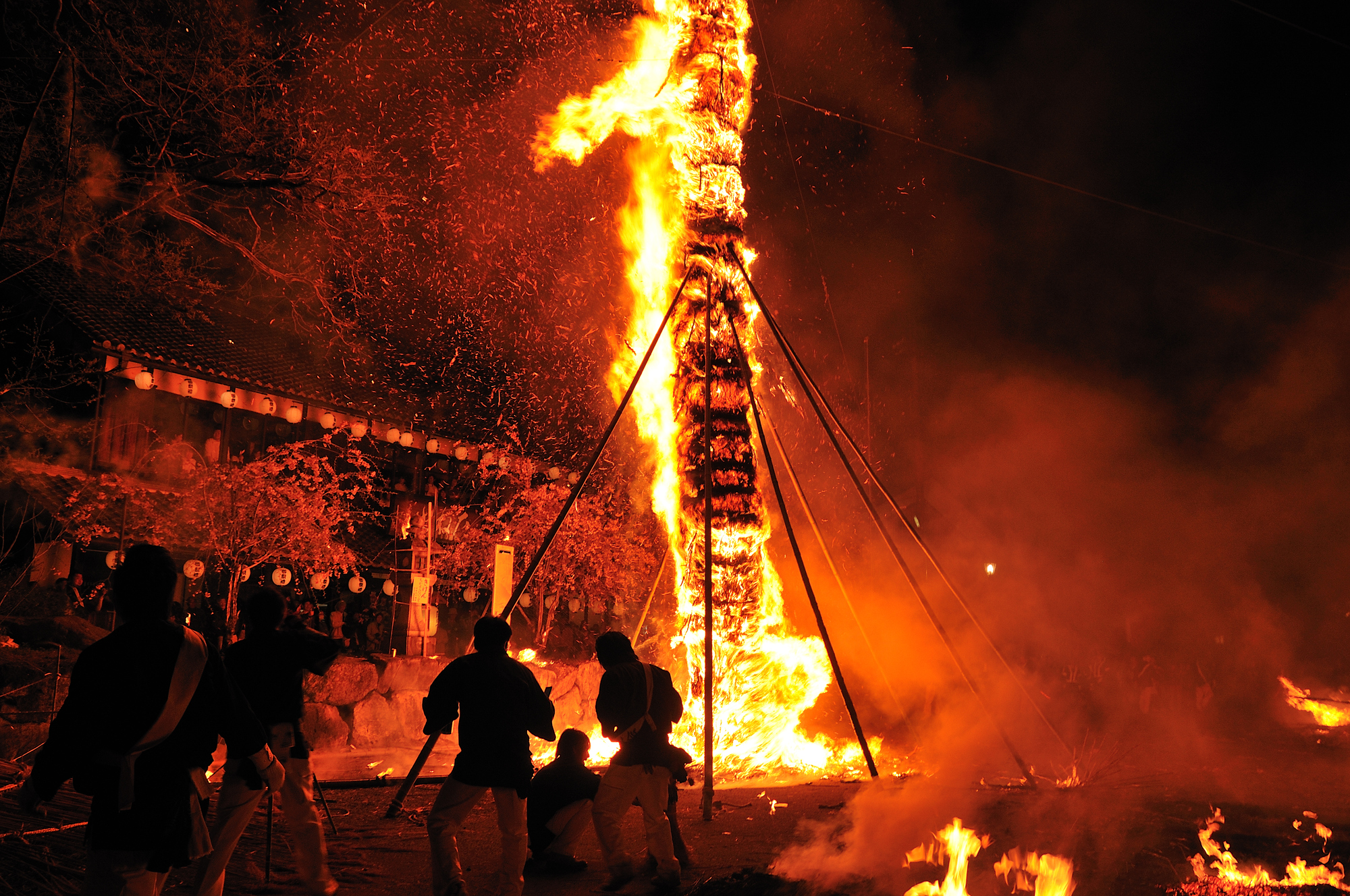 位於滋賀縣近江八幡市的「八幡祭」,是一項傳承超過 1,000 年的國家指定重要無形民俗文化財(※)。這項祭典最令人震驚的場面發生在4月14日晚上的「宵宮祭/松明祭」。數十根巨大的火炬(松明),最高的甚至可達10公尺(※),在日牟禮八幡宮前一齊被點燃。隨著熊熊烈火沖向夜空,現場的氛圍變得莊嚴且充滿原始的張力。第二天則是「本祭」,各村落會抬著裝飾華麗的太鼓神轎在街上巡遊。