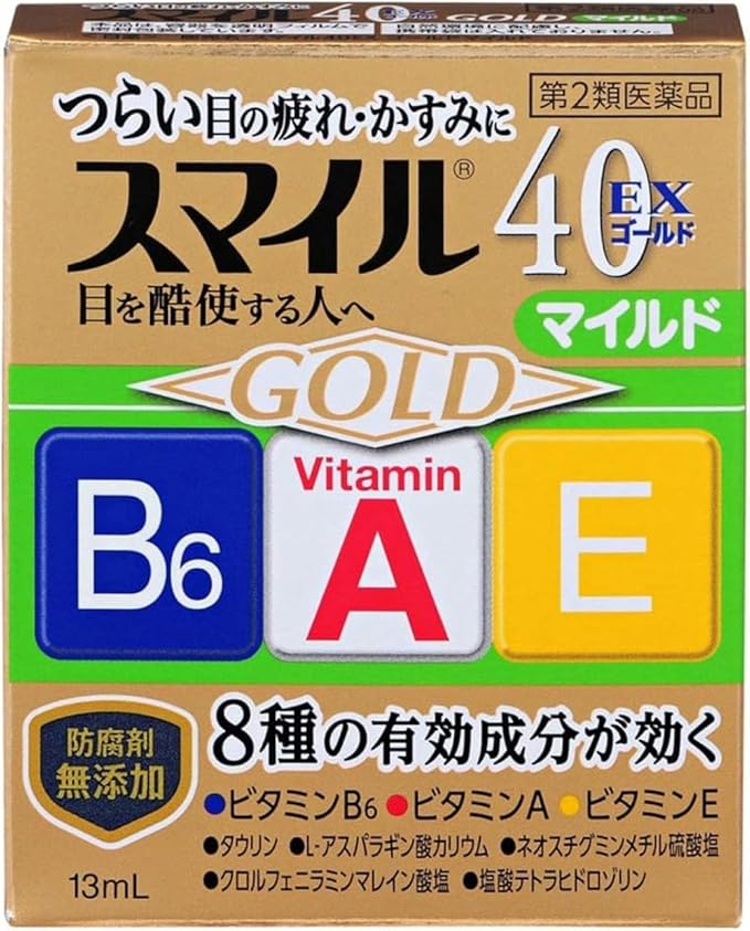 「Smile」品牌是日本長年深受喜愛的經典眼藥水。其中「40EX Gold」含有豐富的維他命成分,可緩解眼部疲勞,預防眼睛模糊和充血。
