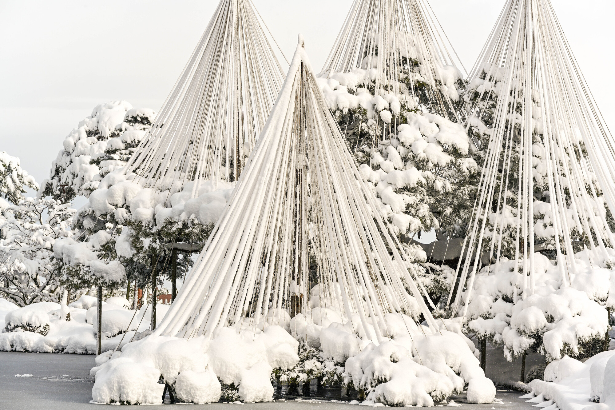 位於金澤的『兼六園』是日本三名園之一(※),而冬季必看的景象便是著名的「雪吊」。這項傳統技法是為了防止松樹在積雪下折斷,利用繩索從樹頂向四面拉開,形成優雅的錐形線條。每年11月至3月都能看到雪吊,但若想欣賞「雪吊×雪景」,最佳時機為12月~2月的降雪日。夜間的「冬季夜間點燈」更是攝影愛好者的最愛,水面倒映著繩索與松樹交織的冬季美景。兼六園鄰近金澤城,可安排半日散策,是北陸冬季最受歡迎的文化景觀之一。
