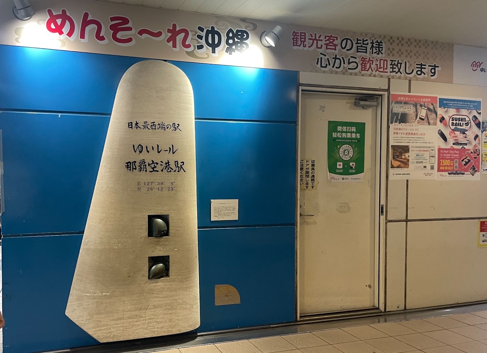 穿過連通道 後,即可看到那霸機場站的剪票口。順帶一提,那霸機場站是「日本最西端的車站(指位於日本領土最西邊的鐵道車站)」,也是日本境內僅有的四個地理極點車站之一