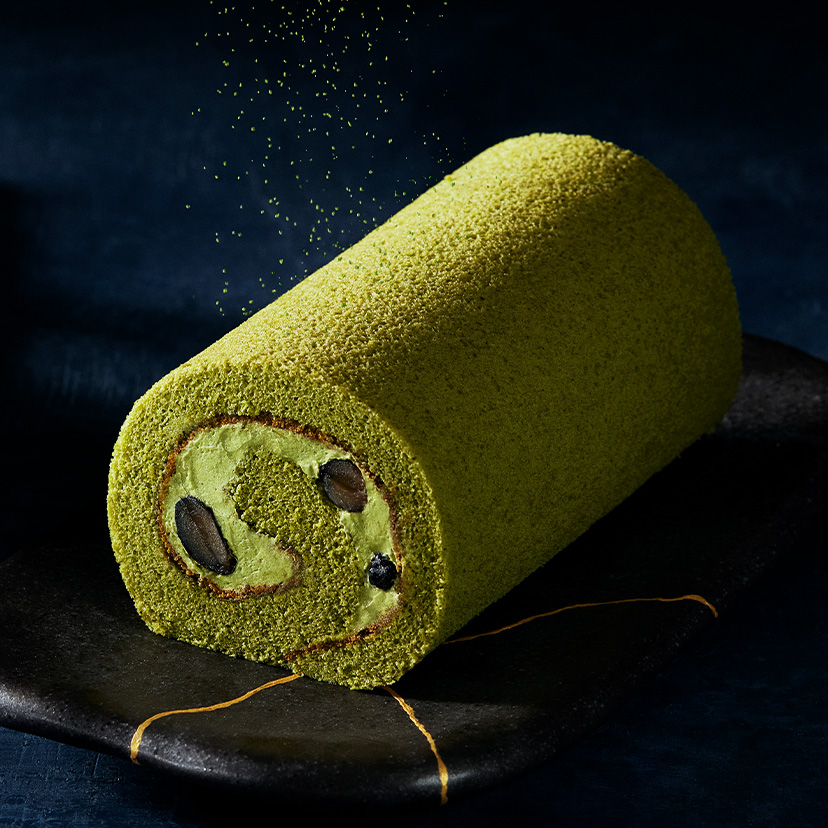 「抹茶千歲 抹茶瑞士捲」使用香氣濃郁的宇治抹茶粉,烘焙出濕潤鬆軟的蛋糕體,並捲入滿滿的丹波黑大豆黑糖抹茶奶油。