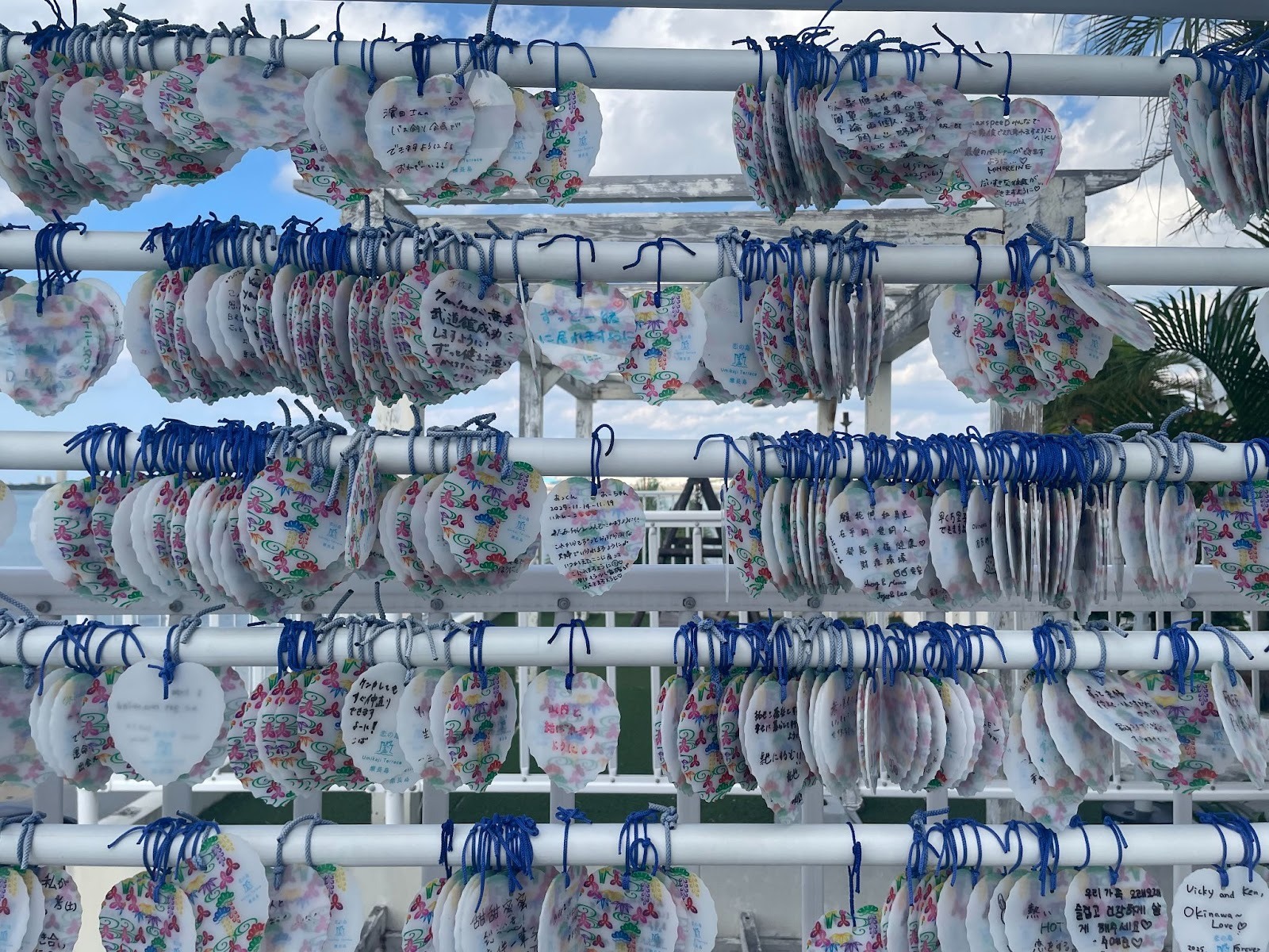 這裡的繪馬並非一般的木頭色,而是印有沖繩傳統「紅型(びんがた,指沖繩最具代表性的傳統染色工藝)」圖案的心形設計。色彩華麗且可愛,既能體驗日本文化,也是非常上鏡的拍照小物。
