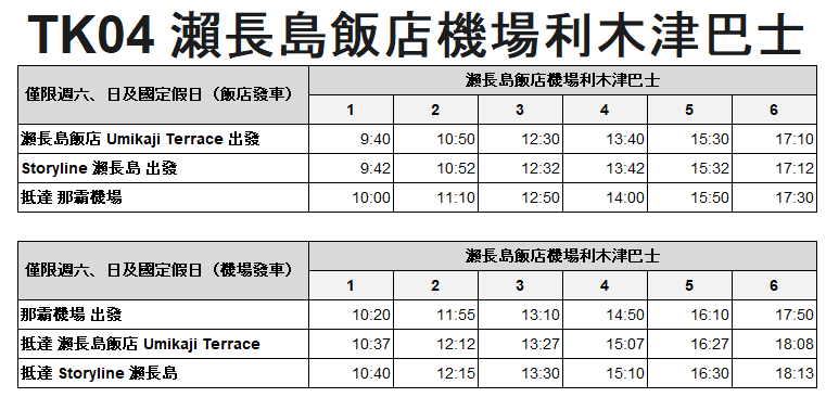 「瀨長島飯店機場利木津巴士」是無需預約即可搭乘的免費接駁巴士。僅在週六、週日及國定假日運行,一天僅有6班,建議提早到站牌候車。