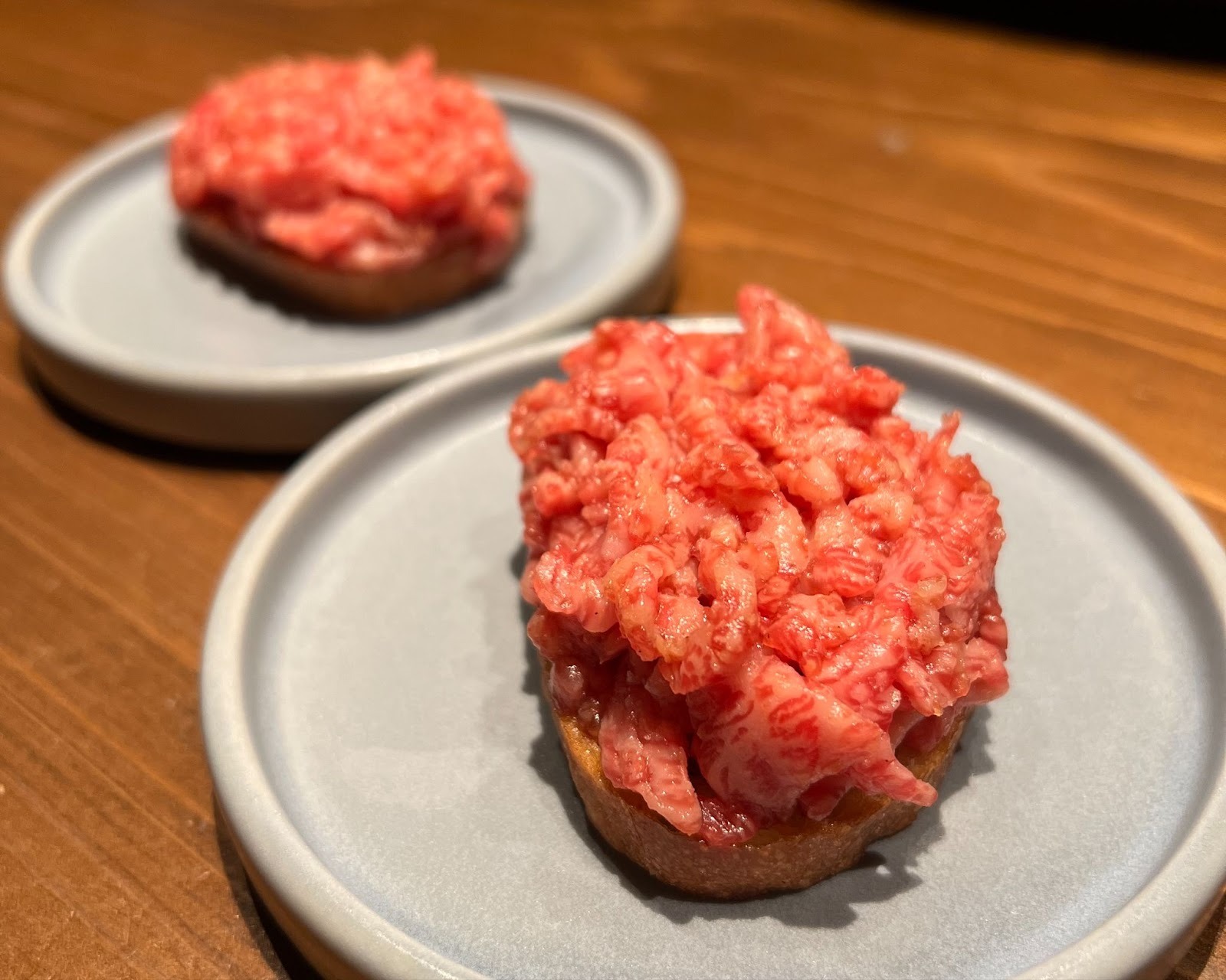 以特製醬汁和蛋黃調味,您可以直接品嚐到黏稠的口感和肉的甘甜。近期也出現了炙燒生拌牛肉(指將生拌牛肉表面稍作炙烤以增添香氣的料理)來提升香氣,或是如飲品般柔嫩的生拌牛肉蓋飯等,如今已成為和牛愛好者心中的特別珍饈。